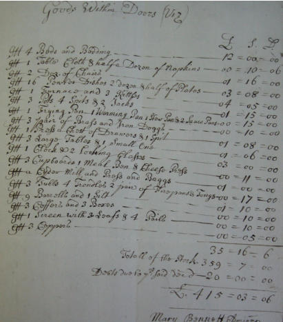 John Bennett is my maternal g-g-g-g-g-g-grandfather and I found his will in the Wiltshire and Swindon Record Office at Trowbridge (now the Wiltshire & Swindon History Centre, Chippenham). There is actually a package of documents that includes not only the will itself but also probate documents, inventories and accounts. These papers have a number of interesting points including the lovely archaic preamble to the will in which he states that he is "very sick and weak of body but of perfect mind and memory". His executor is his youngest son, Thomas, who was only 15 at the time and so wife Mary and eldest son John are appointed as trustees. Amazingly they have to stand one thousand pounds surety to The Archdeacon until Thomas comes of age, a huge sum of money in 1746. But what really brings the will to life are the inventories of the farm and farmhouse. These detail all the livestock and equipment and also "Goods within doors" down to the clock, looking glass and saucepans. A tablecloth and “half dozen of napkins” were valued at 10s 6d (52p) and two dozen chairs at £1 16s 0d (£1.80) with the total, indoors and out including crops and livestock, being valued at £415 3s 6d. Will images by kind permission of Wiltshire & Swindon History Centreback to top